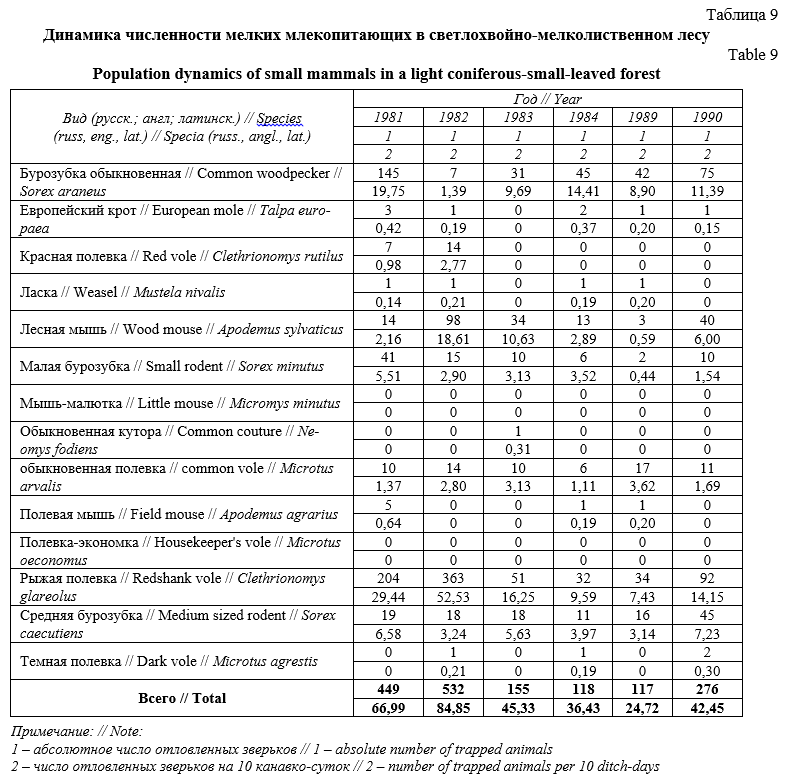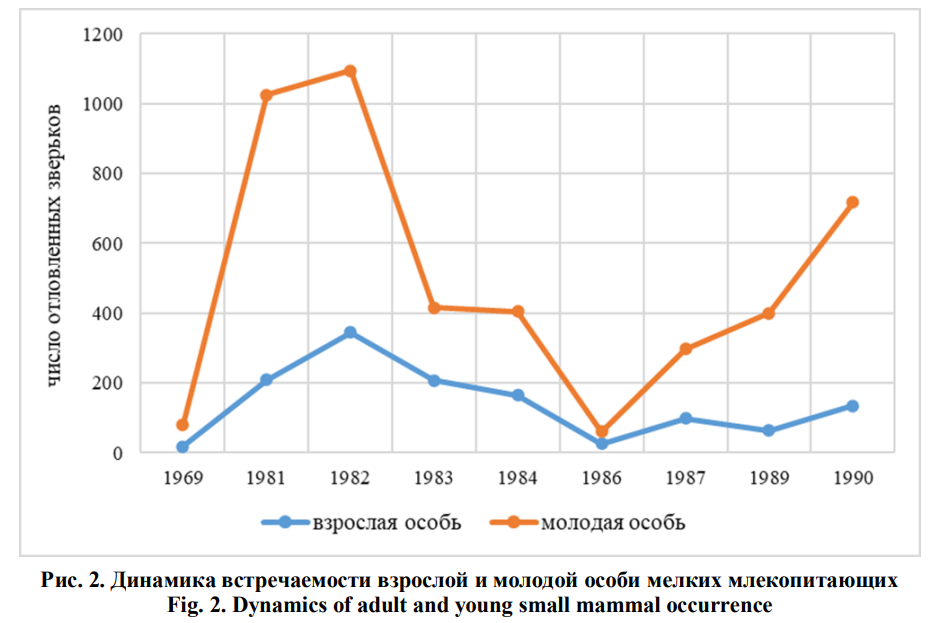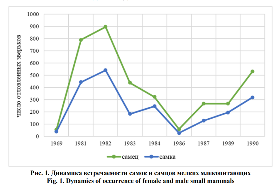 В статье рассматривается сукцессионная динамика мелких млекопитающих в ряду хвойных биогеоценозов заказника «Предуралье». Учет мелких млекопитающих проводился методами ловчих канавок, на линии давилок и живоловок в 1969, 1980–1984, 1986, 1987, 1989 и 1990 гг. На основании проведенных учетов проанализирована и составлена динамика численности мелких млекопитающих в темнохвойном лесу, в вырубках на месте темнохвойного леса, в березниках на месте темнохвойного леса, в светлохвойном лесу и в светлохвойно-мелколиственном лесу. В ряду хвойных биогеоценозов зафиксировано 14 видов: 5 насекомоядных, 8 грызунов и 1 хищник. Максимального обилия виды мелких млекопитающих достигают на стадиях светлохвойно-мелколиственного леса. Рыжая полевка, обыкновенная бурозубка, средняя бурозубка и лесная мышь в ряду хвойных биогеоценозов заказника «Предуралье» наиболее многочисленны. Реже всего встречается ласка, обыкновенная кутора, полевка-экономка и темная полевка. Проанализирована динамика встречаемости мелких млекопитающих в зависимости от пола и возраста. Достаточно чаще встречаются молодые особи, и несущественно больше, в отличие от самок, обнаружены молодые самцы за счет своей высокой активности и расселения. Биоразнообразие мелких млекопитающих изученной территории находится на достаточно высоком уровне.Загрузки